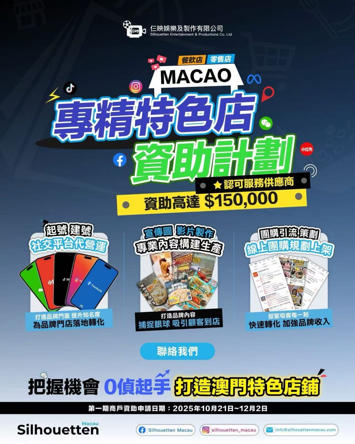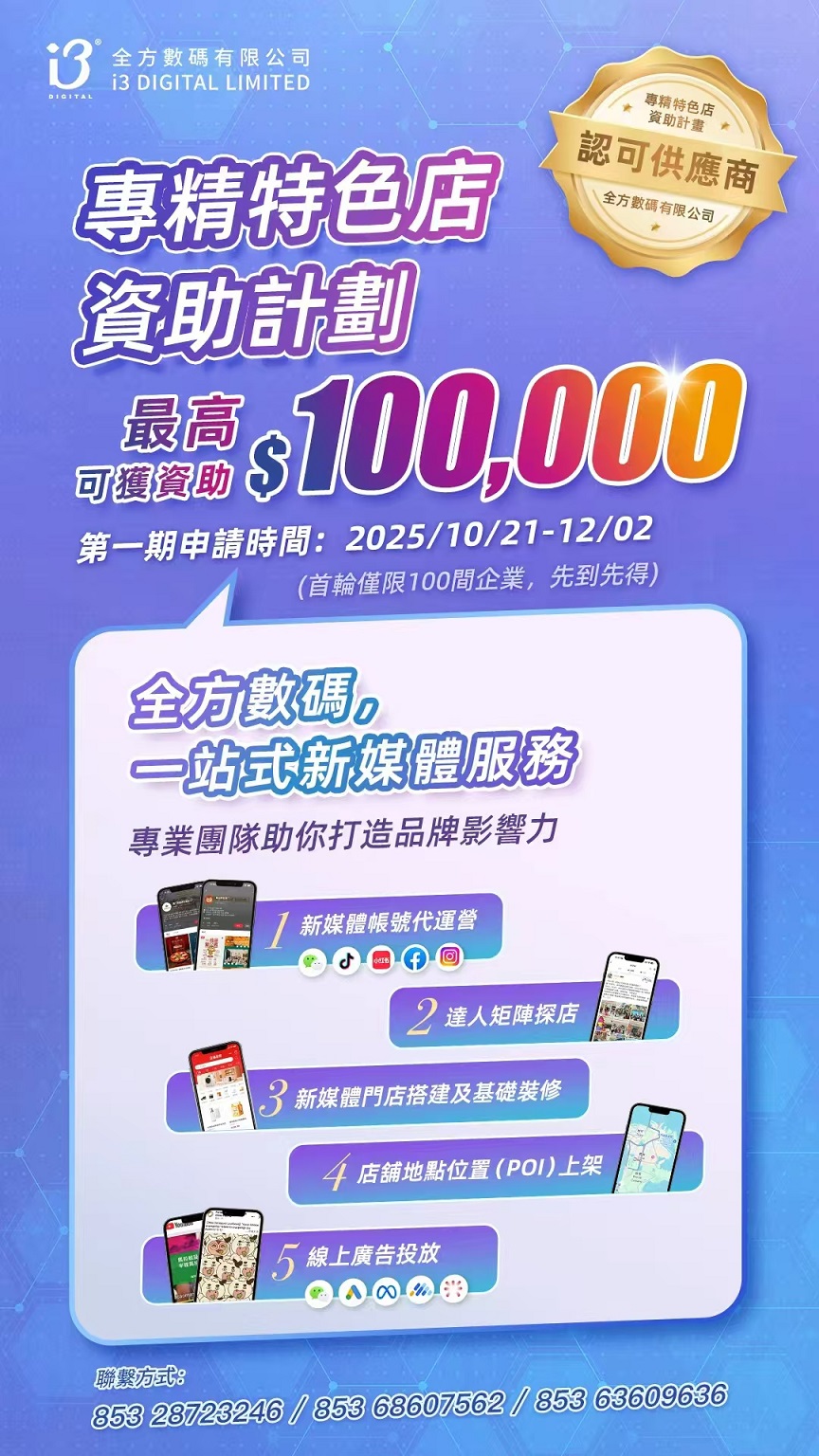 為推動本澳中小企業走向專業化、精品化及特色化發展,發掘更多兼具特色技藝與匠心品質的中小商戶,助力中小企提質升級並增強市場競爭力,由經科局主辦,生產力暨科技轉移中心執行的《專精特色店資助計劃》已接受報名,申請期由2025 年10 月21 日至12 月2 日。獲評企業可享:線上營銷、特色店面、IP 聯乘商品指定費用60% 資助;一對一顧問指導,及商業計劃書、經營方案診改。