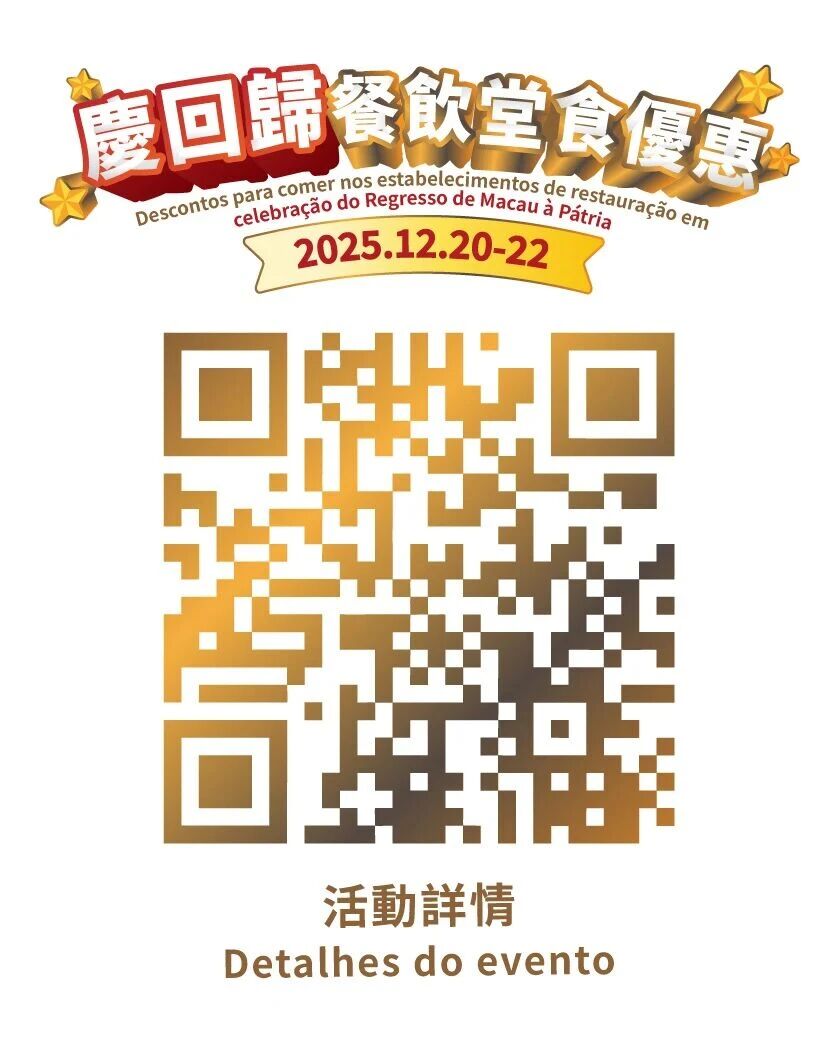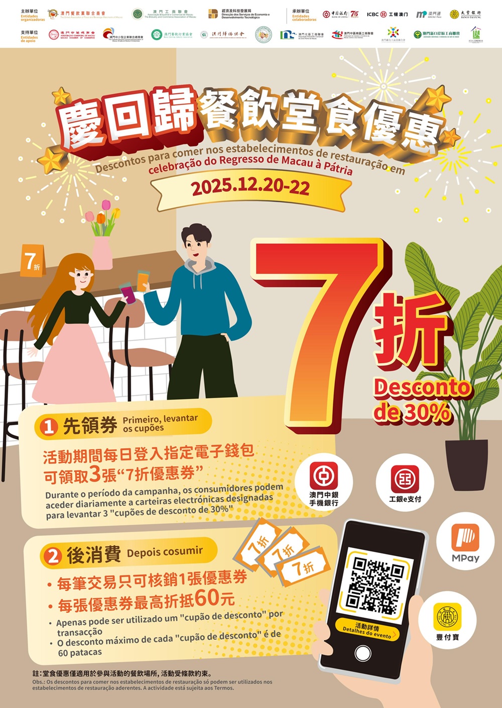 為熱烈慶祝澳門回歸祖國26周年,經濟及科技發展局聯同澳門餐飲業聯合商會及澳門工商聯會,澳門中小型企業聯合總商會為是次活動支持單位之一,攜手本澳超過500間餐廳,於12月20至22日期間,推出“慶回歸餐飲堂食優惠"活動,一連3日提供7折餐飲堂食優惠,與居民一起歡慶回歸,激發社區經濟活力。